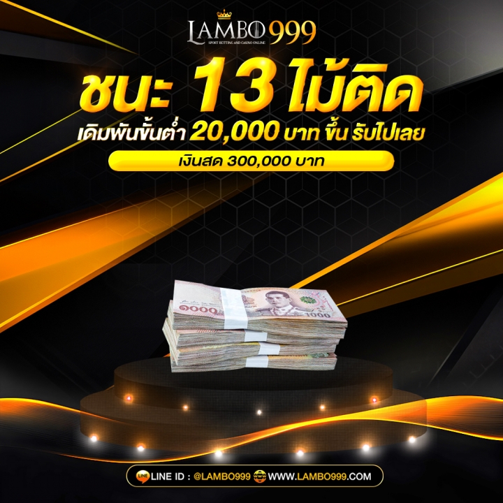 โปรโมชั่นเดิมพันบาคาร่า ชนะ/แพ้ 13 ตาติด รับไปเลย " เงินสด 300,000 บาท " สมาชิกเดิมพันขั้นต่ํา 20,000 บาท/ตา ชนะ หรือแพ้ 13 ตาติดต่อกัน หากเริ่มนับใหม่เสมอ (เดิมพันฝั่ง Banker หรือ Player ในเกม คาสิโน รับได้ 1 ครั้ง/คน เท่านั้น