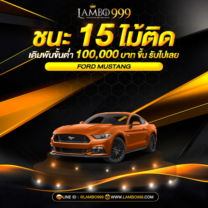 โปรโมชั่นเดิมพันบาคาร่า ชนะ/แพ้ 15 ตาติด รับไปเลย “ FORD MUSTANG ” สมาชิกเดิมพันขั้นต่ำ 100,000 บาท/ตา ชนะ หรือแพ้ 15 ตาติดต่อกัน หากเสมอเริ่มนับใหม่ (เดิมพันฝั่ง Banker หรือ Player ในเกม คาสิโน รับได้ 1 ครั้ง/คน เท่านั้น