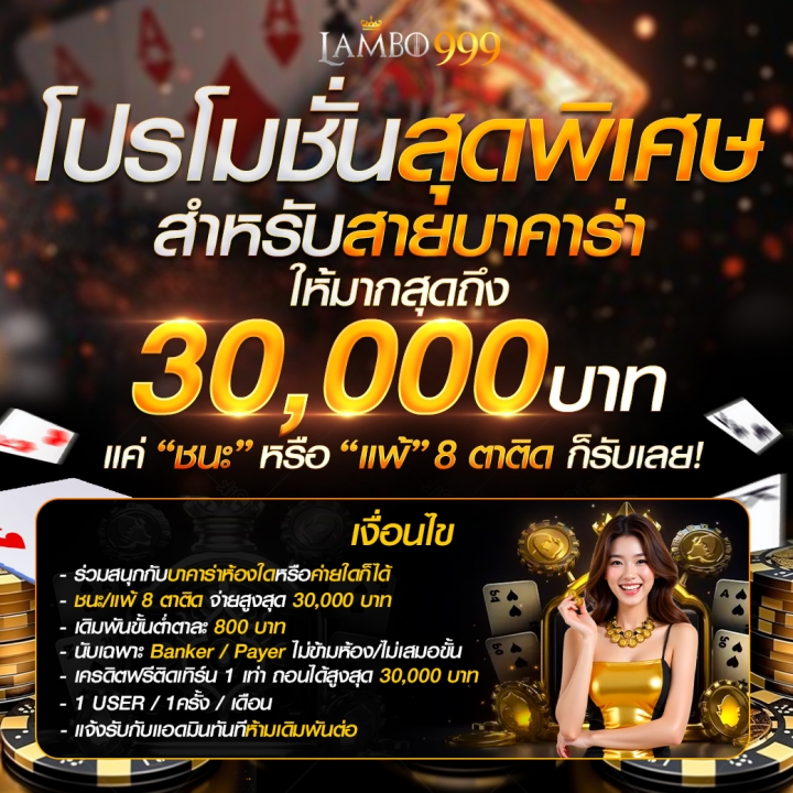 โปรโมชั่นเดิมพันบาคาร่า ชนะ/แพ้ 13 ตาติด รับไปเลย " เงินสด 300,000 บาท " สมาชิกเดิมพันขั้นต่ํา 20,000 บาท/ตา ชนะ หรือแพ้ 13 ตาติดต่อกัน หากเริ่มนับใหม่เสมอ (เดิมพันฝั่ง Banker หรือ Player ในเกม คาสิโน รับได้ 1 ครั้ง/คน เท่านั้น