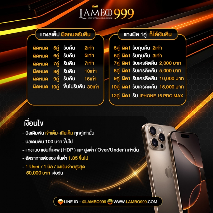 โปรโมชั่นเดิมพันบาคาร่า ชนะ/แพ้ 10 ตาติด รับไปเลย " iPhone 15 Pro max " สมาชิกเดิมพันขั้นต่ํา 800 บาท/ตา ชนะ หรือแพ้ 11 ตาติดต่อกัน หากเสมอเริ่มนับใหม่ (เดิมพันฝั่ง Banker หรือ Player ในเกม คาสิโน รับได้ 1 ครั้ง/คน เท่านั้น