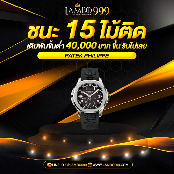 โปรโมชั่นเดิมพันบาคาร่า ชนะ/แพ้ 15 ตาติด รับไปเลย “ PATEK PHILIPPE ” สมาชิกเดิมพันขั้นต่ำ 40,000 บาท/ตา ชนะ หรือแพ้ 15 ตาติดต่อกัน หากเสมอเริ่มนับใหม่ (เดิมพันฝั่ง Banker หรือ Player ในเกม คาสิโน รับได้ 1 ครั้ง/คน เท่านั้น
