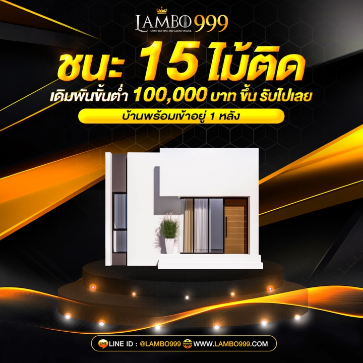 โปรโมชั่นเดิมพันบาคาร่า ชนะ/แพ้ 15 ตาติด รับไปเลย “ บ้านพร้อมเข้าอยู่ 1 หลัง ” สมาชิกเดิมพันขั้นต่ำ 100,000 บาท/ตา ชนะ หรือแพ้ 15 ตาติดต่อกัน หากเสมอเริ่มนับใหม่ (เดิมพันฝั่ง Banker หรือ Player ในเกม คาสิโน รับได้ 1 ครั้ง/คน เท่านั้น