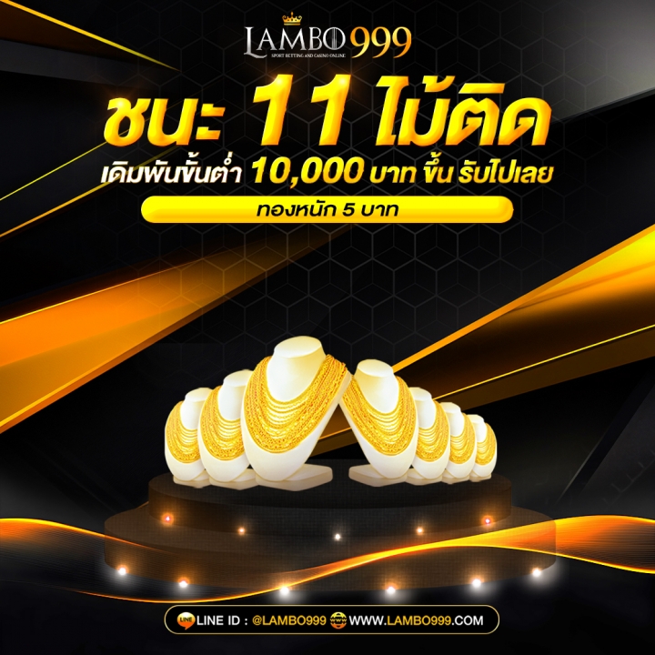 โปรโมชั่นเดิมพันบาคาร่า ชนะ/แพ้ 11 ตาติด รับไปเลย " ทองคำน้ำหนัก 5 บาท " สมาชิกเดิมพันขั้นต่ำ 10,000 บาท/ตา ชนะ หรือแพ้ 11 ตาติดต่อกัน หากเสมอเริ่มนับใหม่ (เดิมพันฝั่ง Banker หรือ Player ในเกม คาสิโน รับได้ 1 ครั้ง/คน เท่านั้น